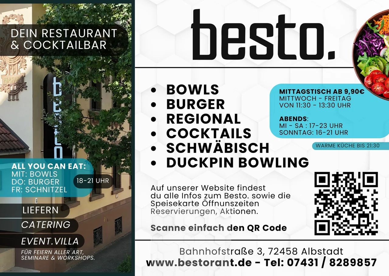 Willkommen in unseremSommergarten #hinter dem Hausim Besto in Albstadt! Mit 65 Plätzen bietet dieser idyllische Rückzugsort inmitten derInnenstadtein einzigartigesGroßstadtflair.Genießen Sie die frische Luft und das lebhafte Ambiente, während Sie sich mit Freunden oder Familie entspannen. Ob ein kühles Getränk oder ein leichtes Sommergericht – unser Sommergarten istder ideale Ort,um die warmen Tage in vollen Zügen zu genießen. Kommen Sie vorbei und erleben Sie die perfekte Kombination aus Natur und urbanem Lebensstil!